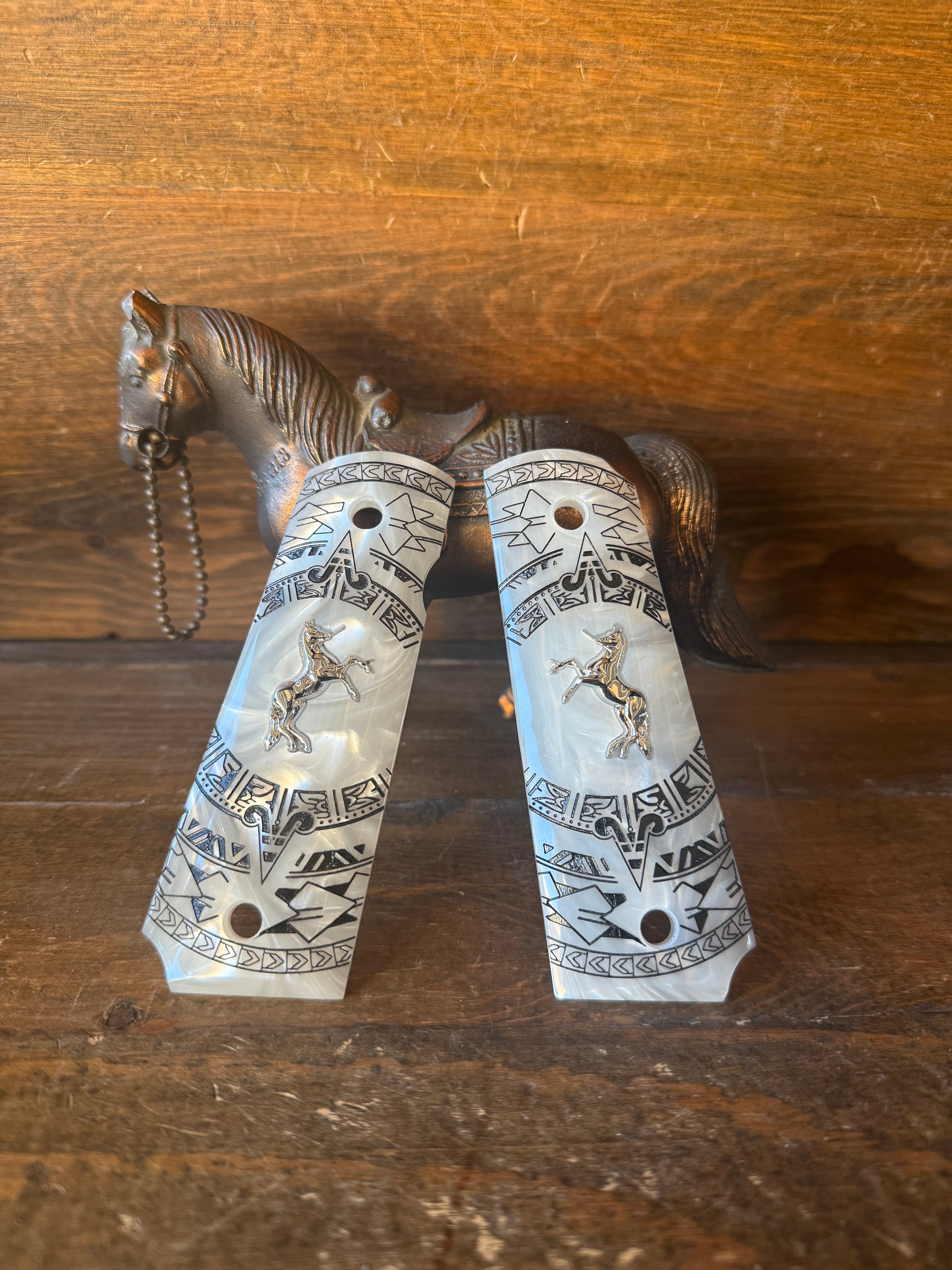 White Aztec/Silver horse Pearl grips (1911)$34.00 USD