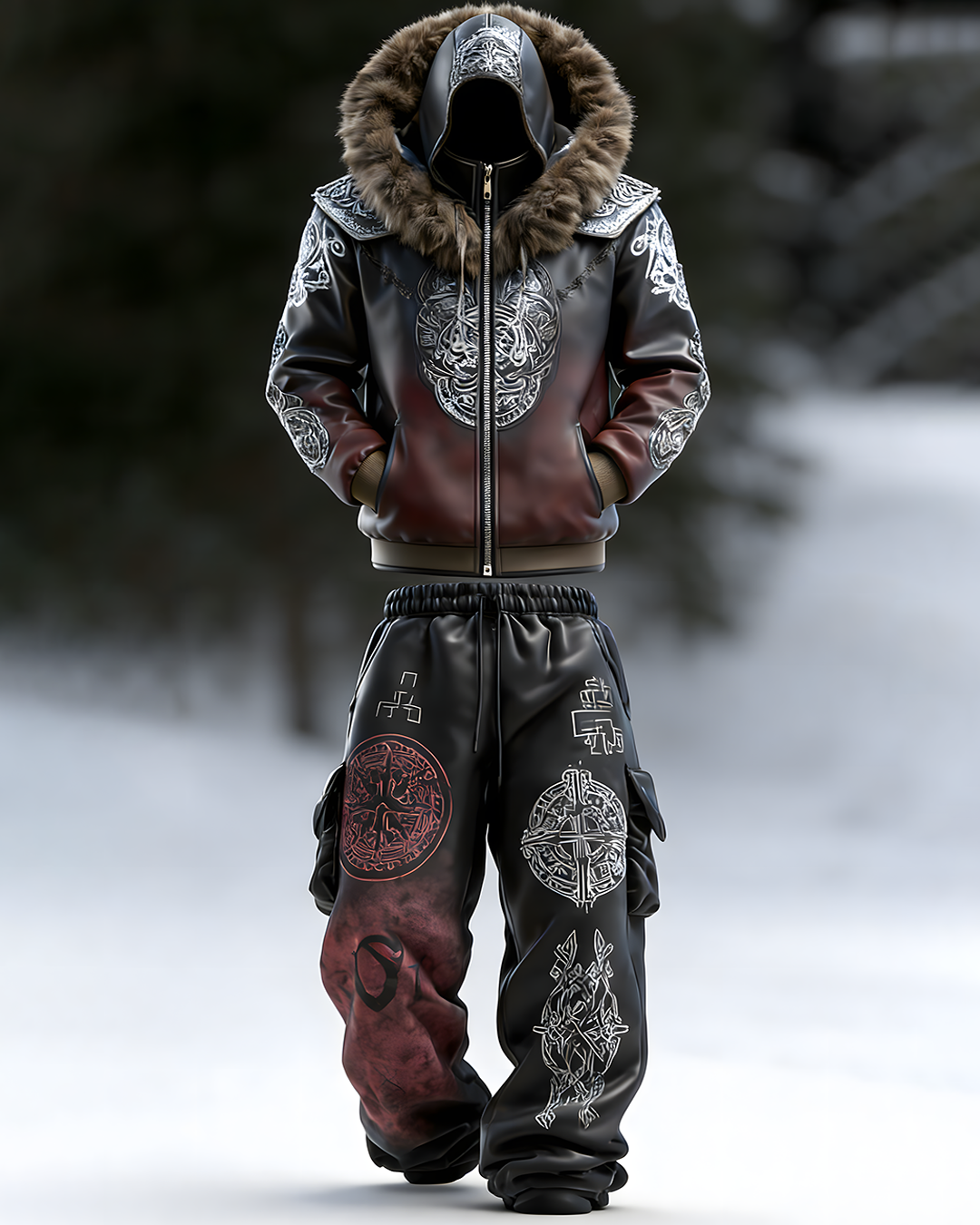 Men's Winter Warmth Wolf Faux Fur Hoodie and Pants Two-Piece Set 7352$53.99 USD$89.98 USD