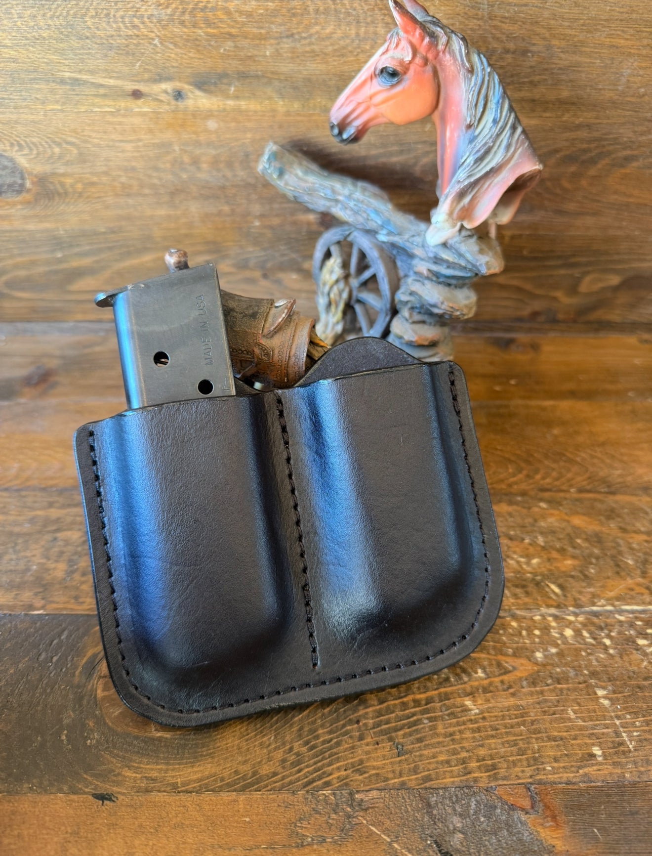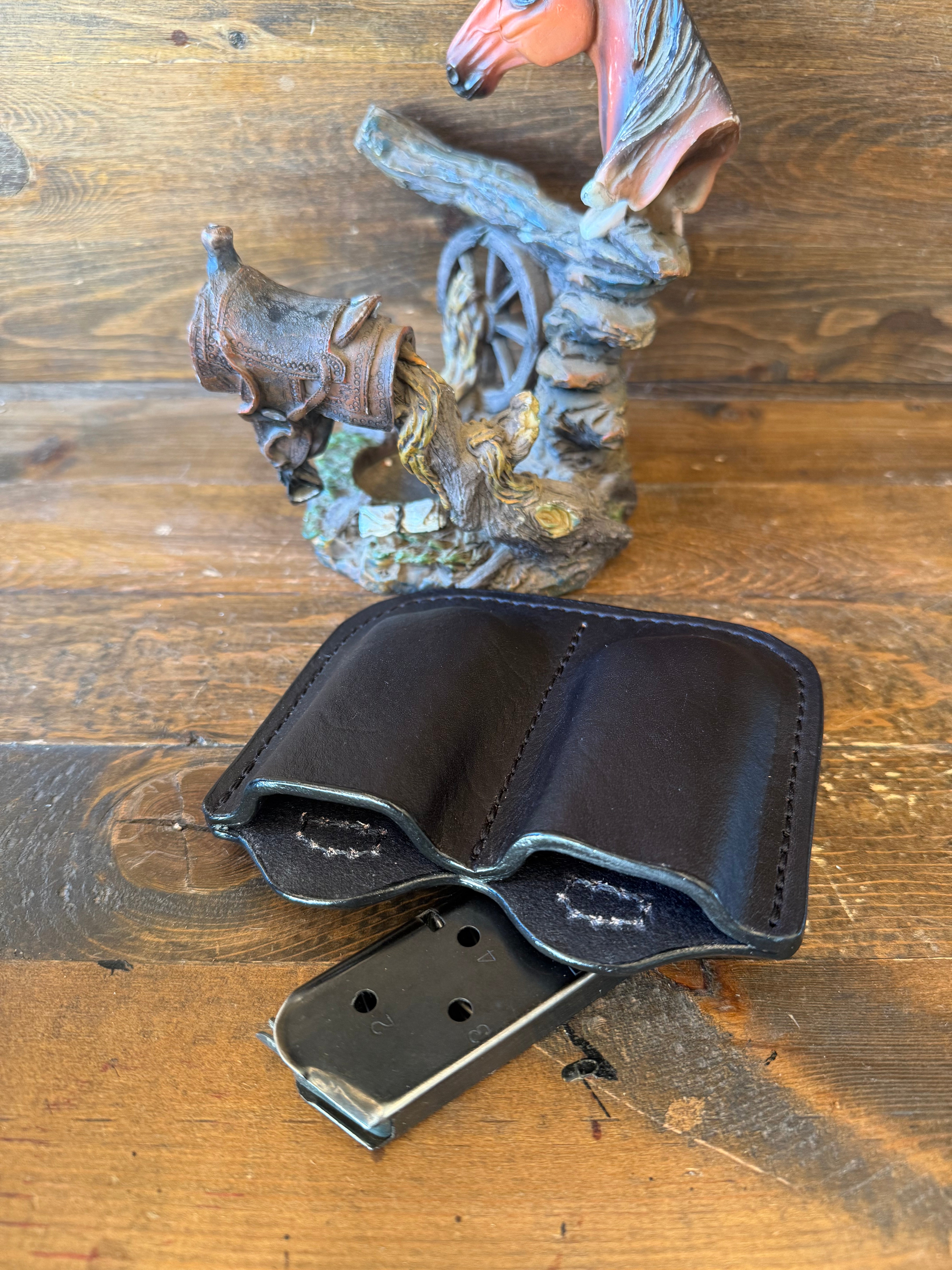 #H-258. Black veg tan leather. 2 magazine holder holster . Fits most of 1911 models magazines. Or single stacked. More colors available by order.