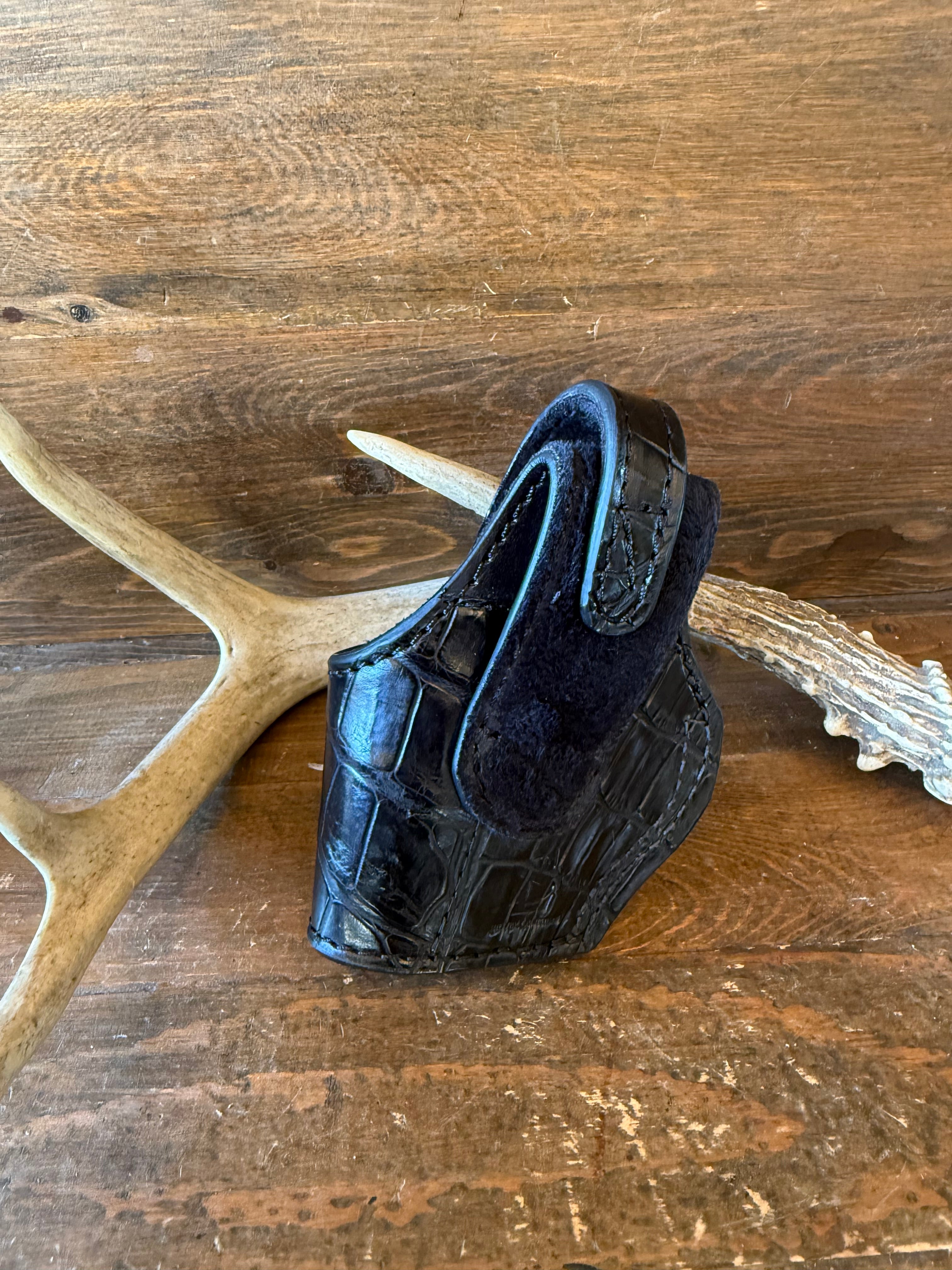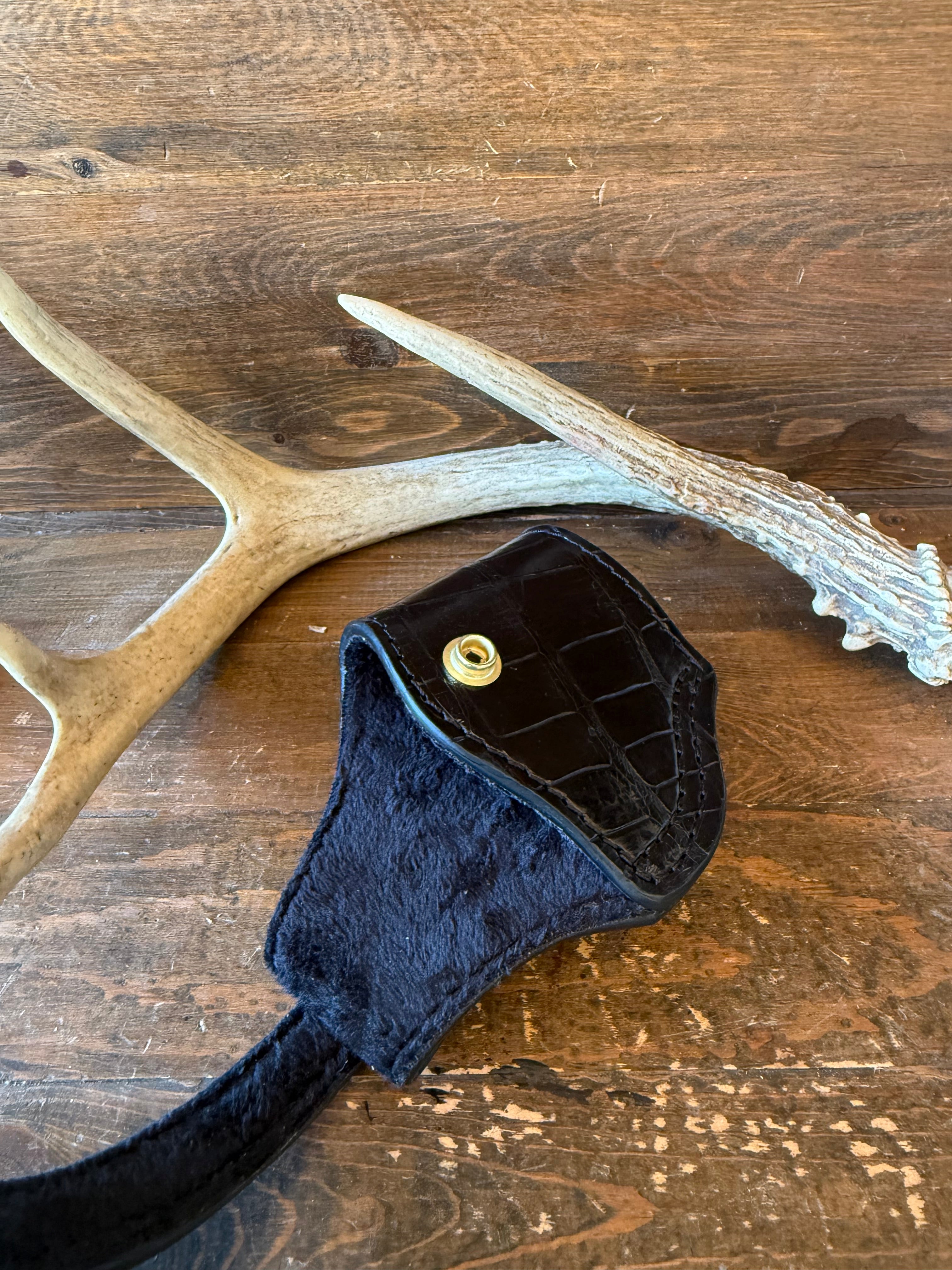 # H -148-2 Black alligator/crocodile belly skin compact holster. Gold color snap button Fits most of 1911 models. Soft velvet interior to prevent scratches.
