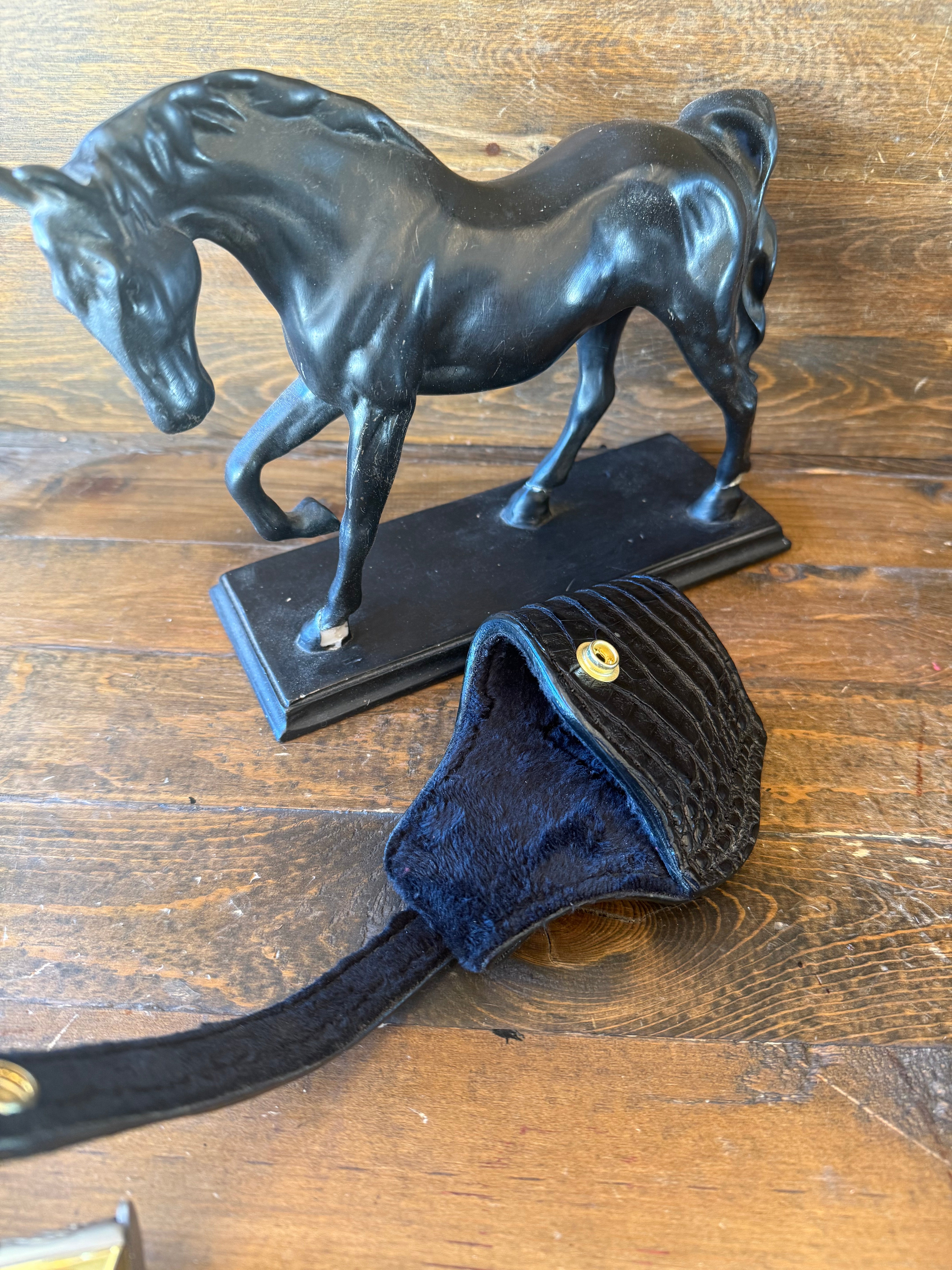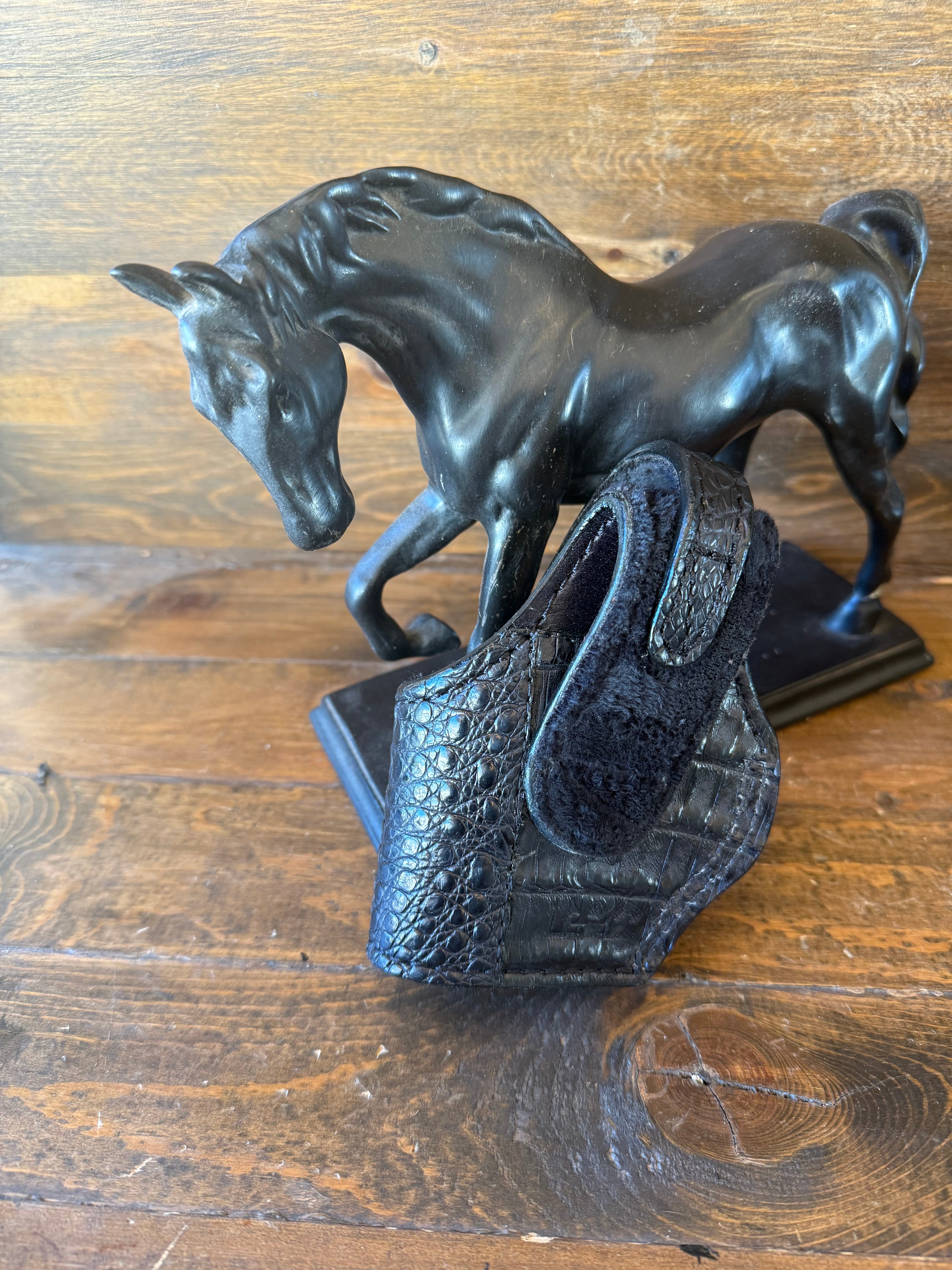 # H-231-2 Black crocodile/caiman belly skin compact holster. W/gold snap fastener. Fits most of 1911 models. Soft velvet interior to prevent scratches. More colors available by order.