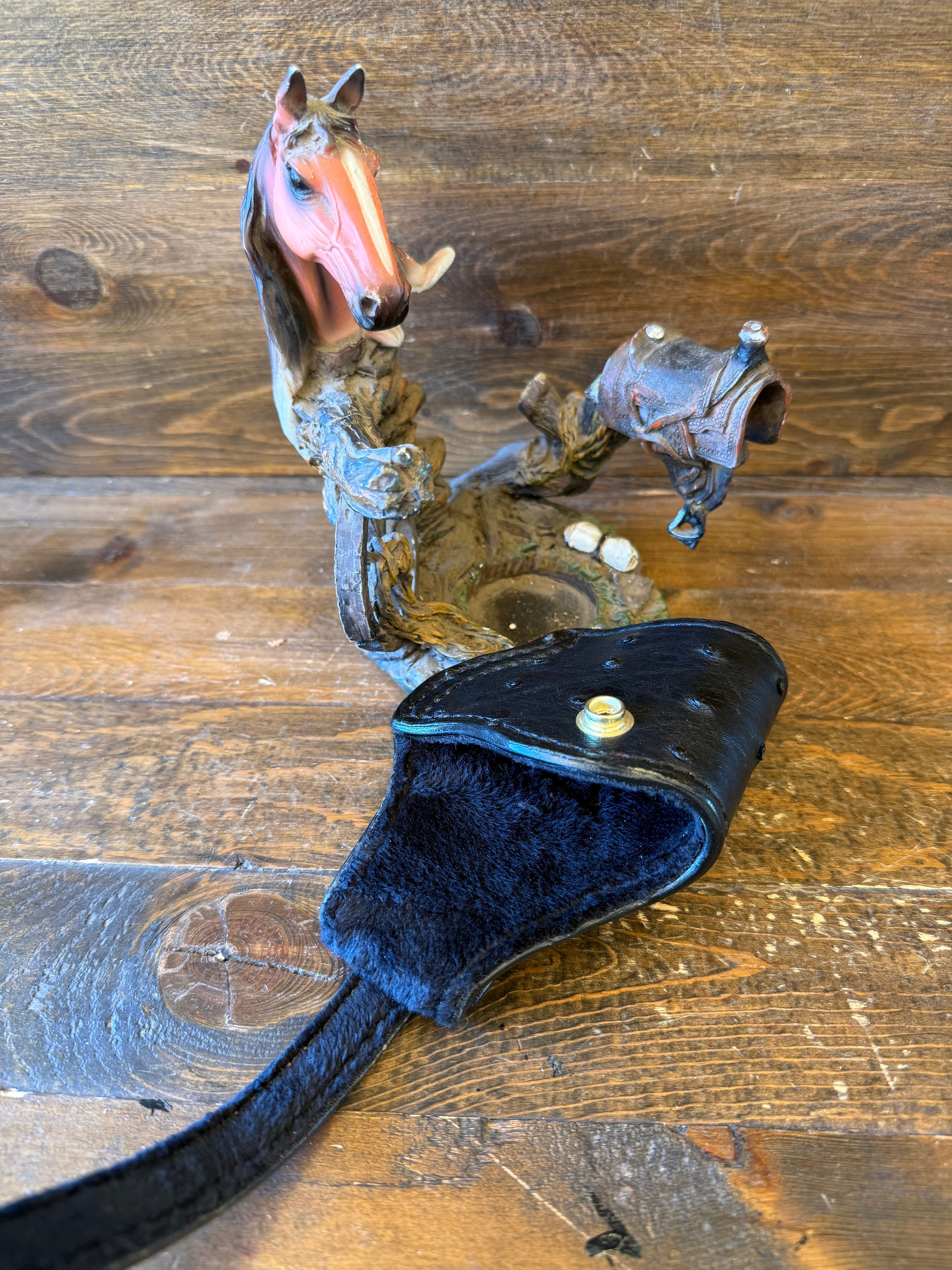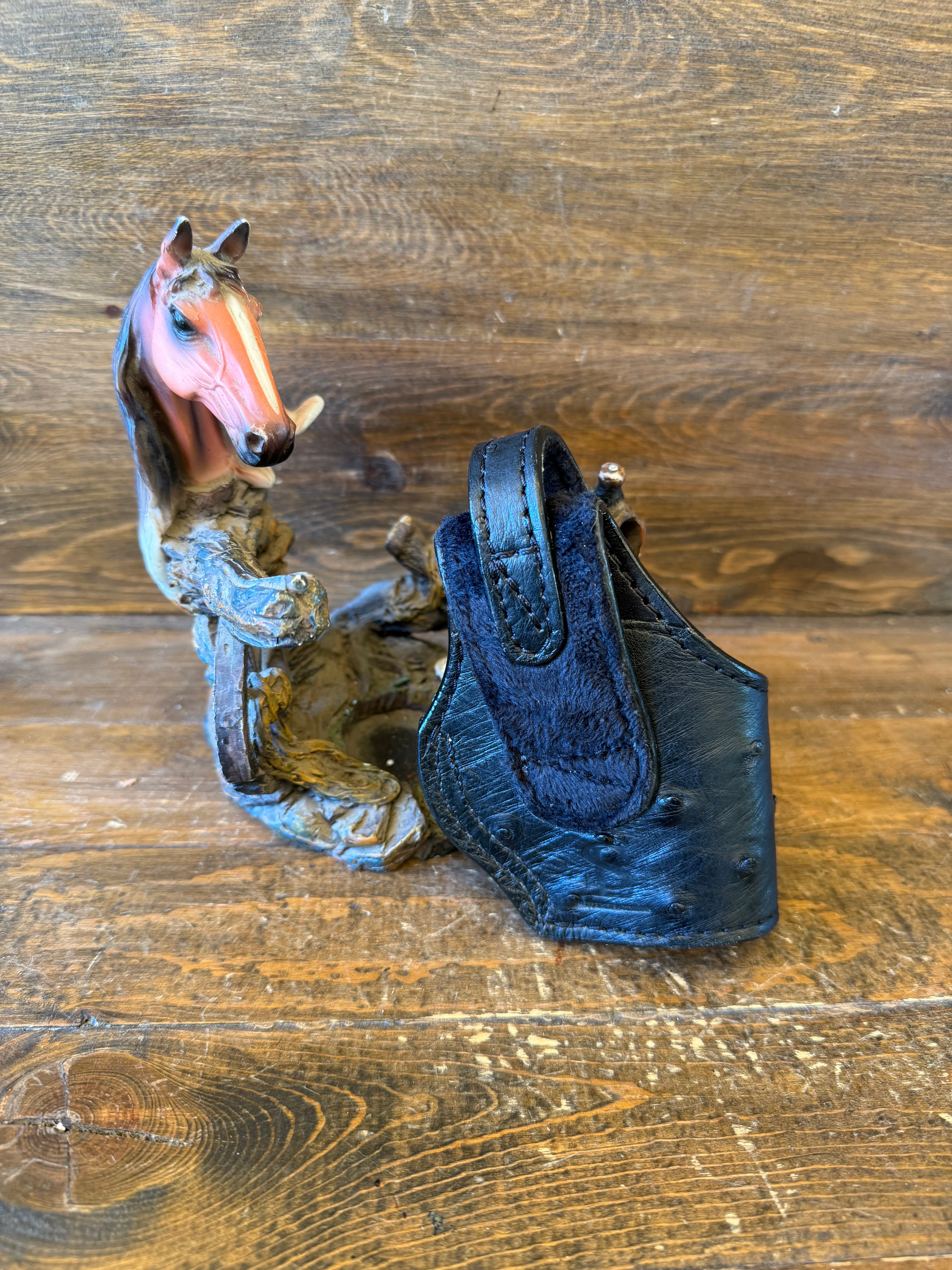 # H-149-L-3 Black ostrich skin compact holster. For left carry. Fits most of 1911 models. Gold color snap. Soft velvet interior to prevent scratches. More colors available by order.