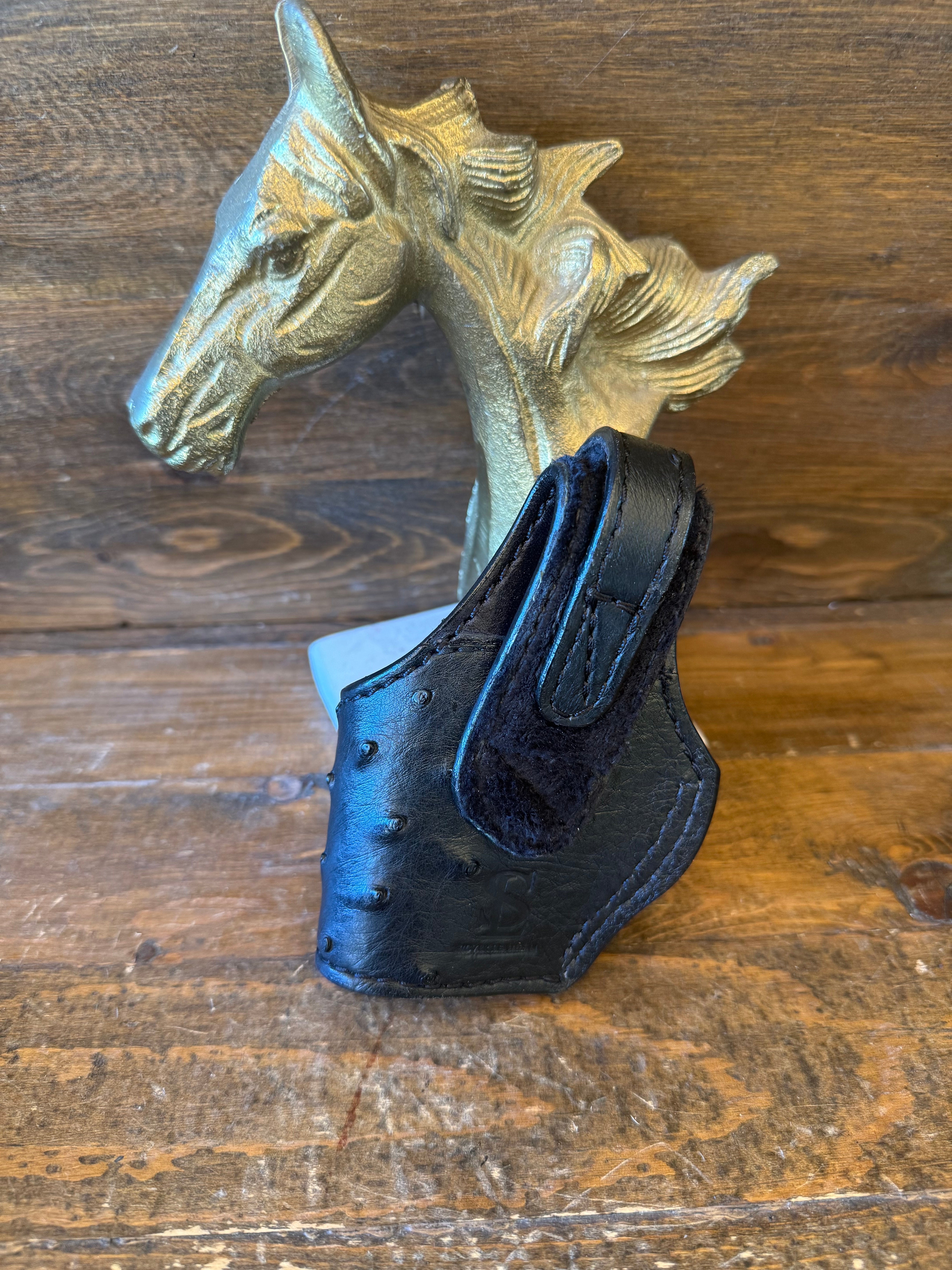 # H-353 Black ostrich skin compact holster.. Fits Black label 380 and small 1911 models. Soft velvet interior to prevent scratches. More colors available by order.