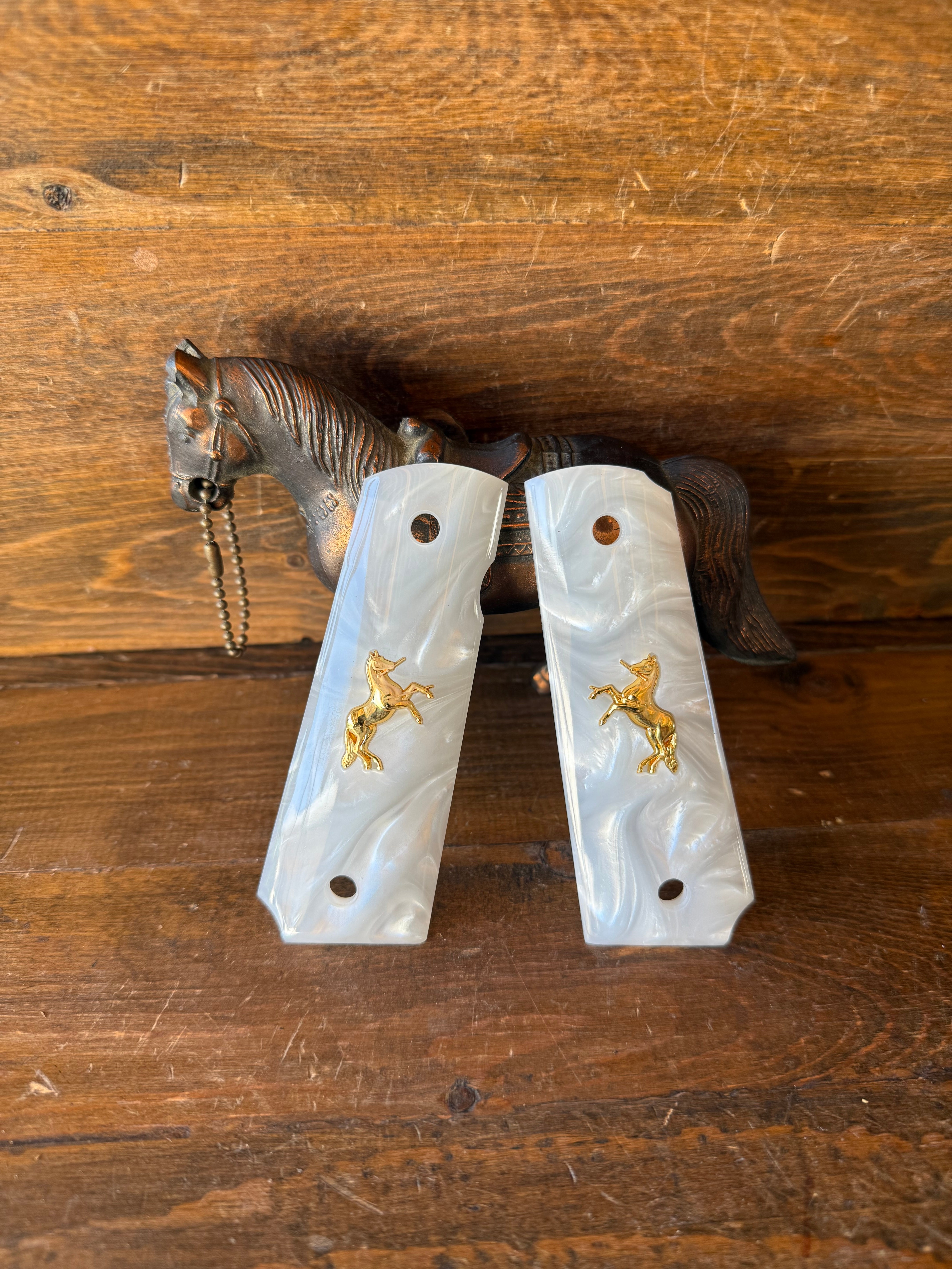 #G-104 Pearl color w/gold horse 1911 grips. Fits full government models and commander models. More to choose.