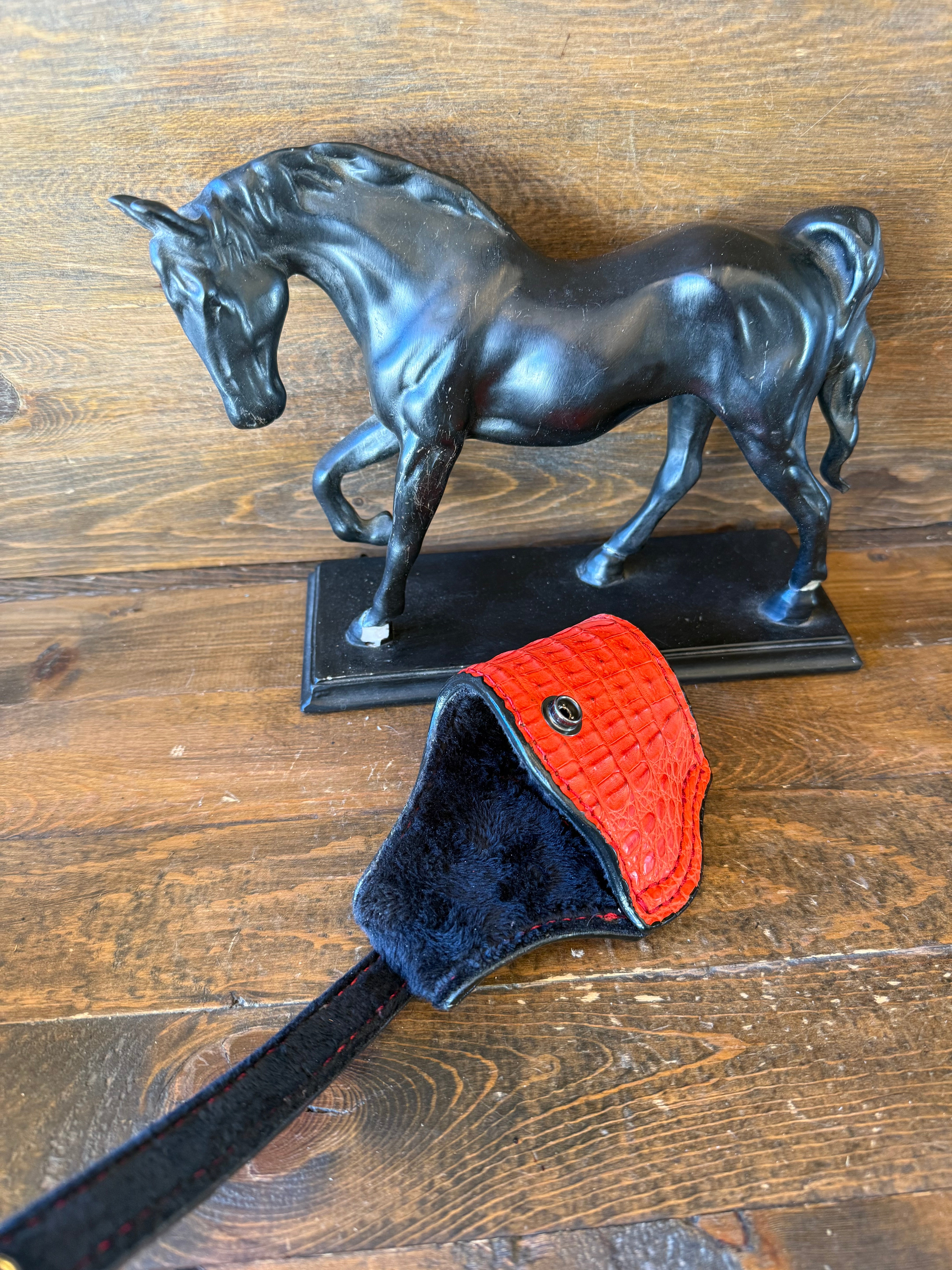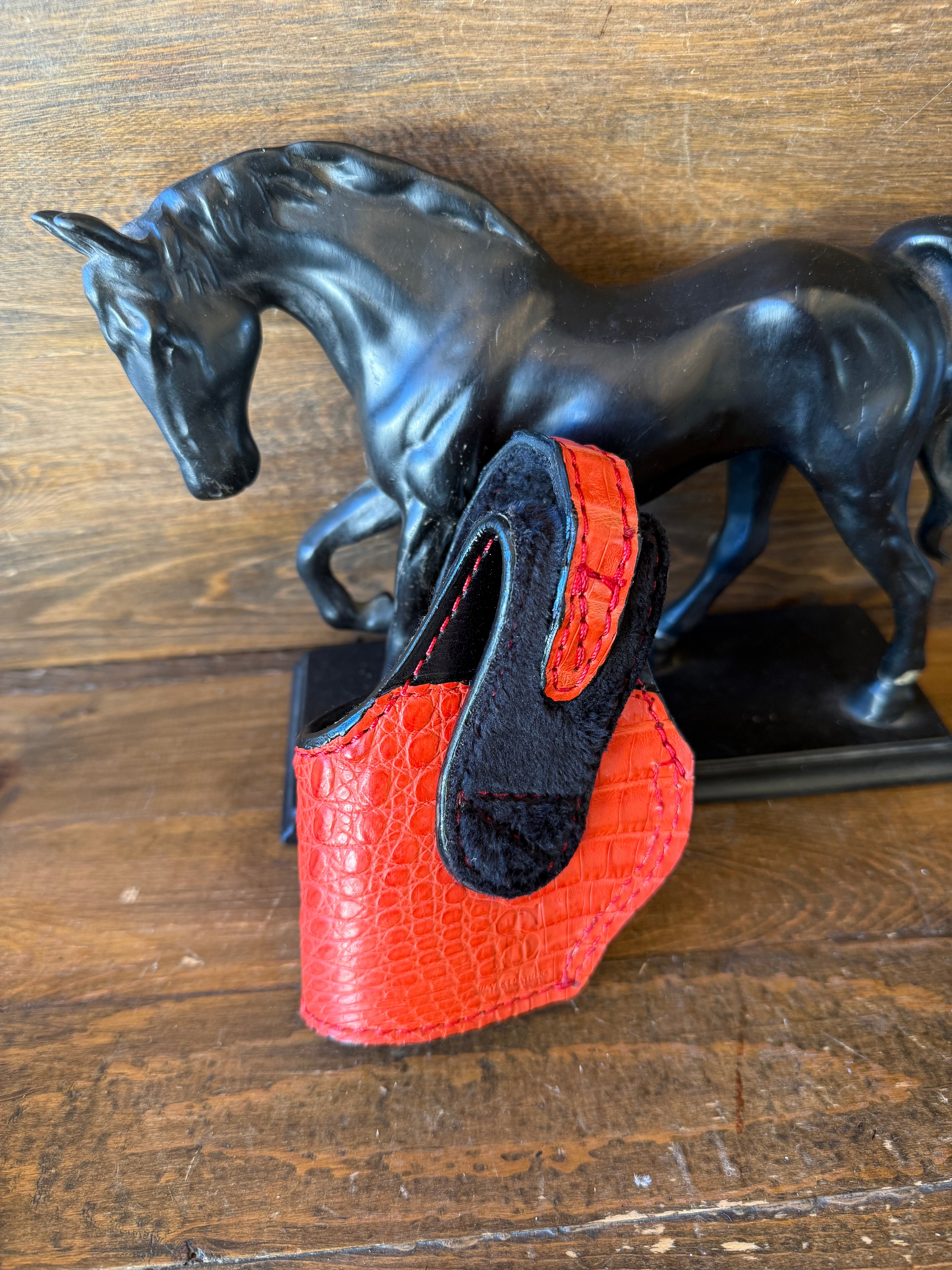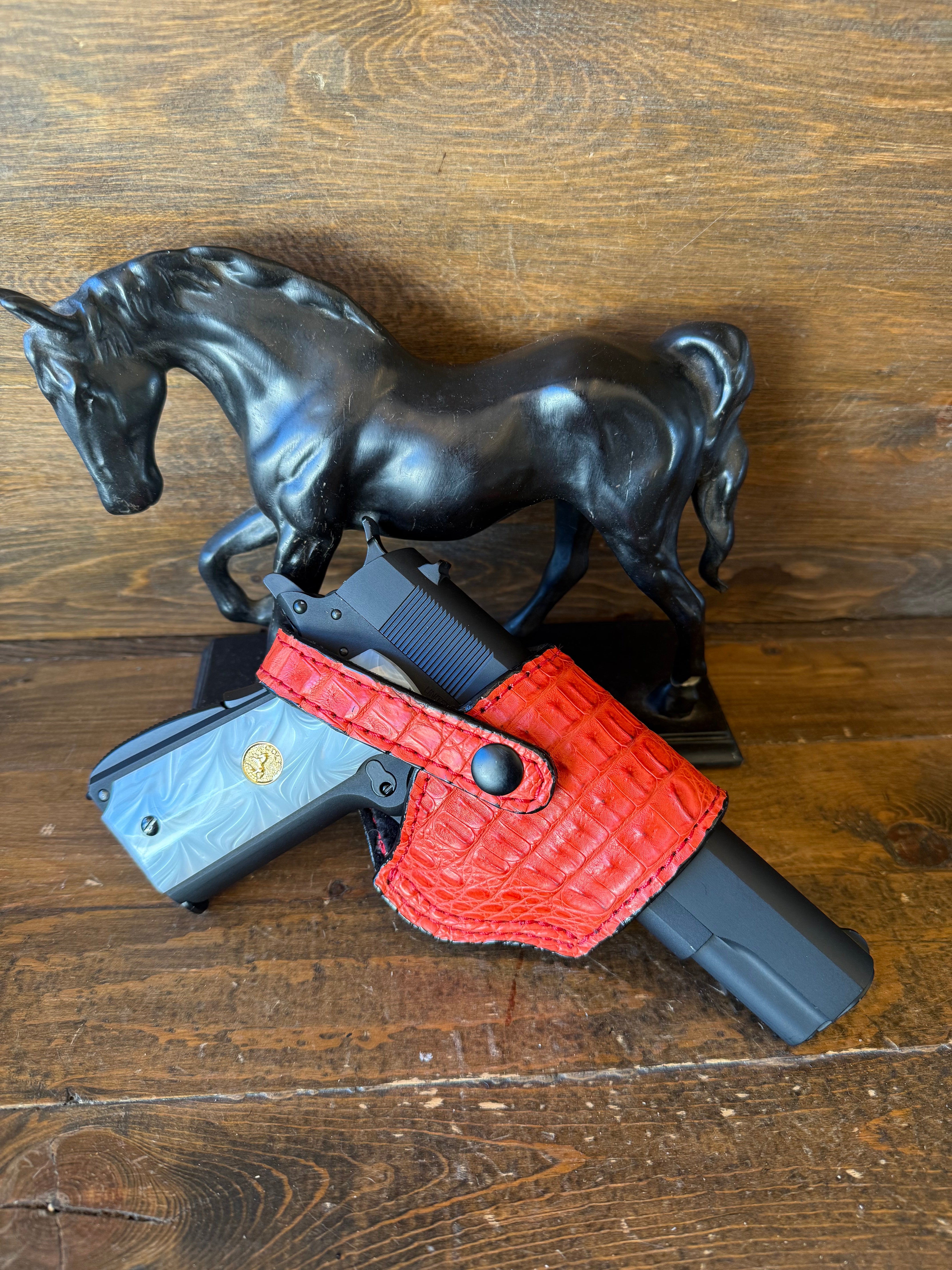 # H-343 . Red Crocodile/caiman Hornback skin luxury compact holster. Black color snap button. Fits most of 1911 models. Luxury red velvet interior to prevent scratches. More colors available by order.