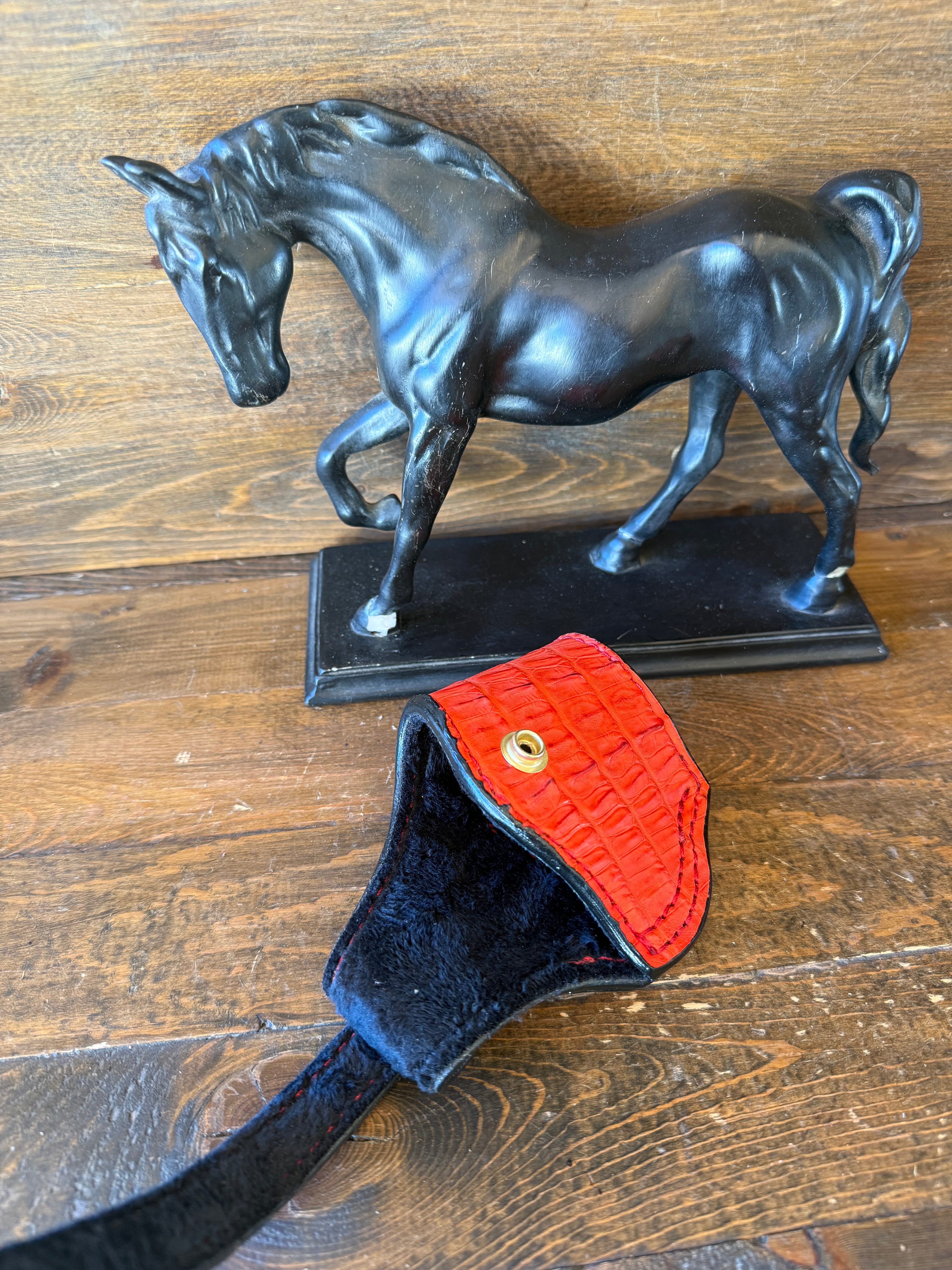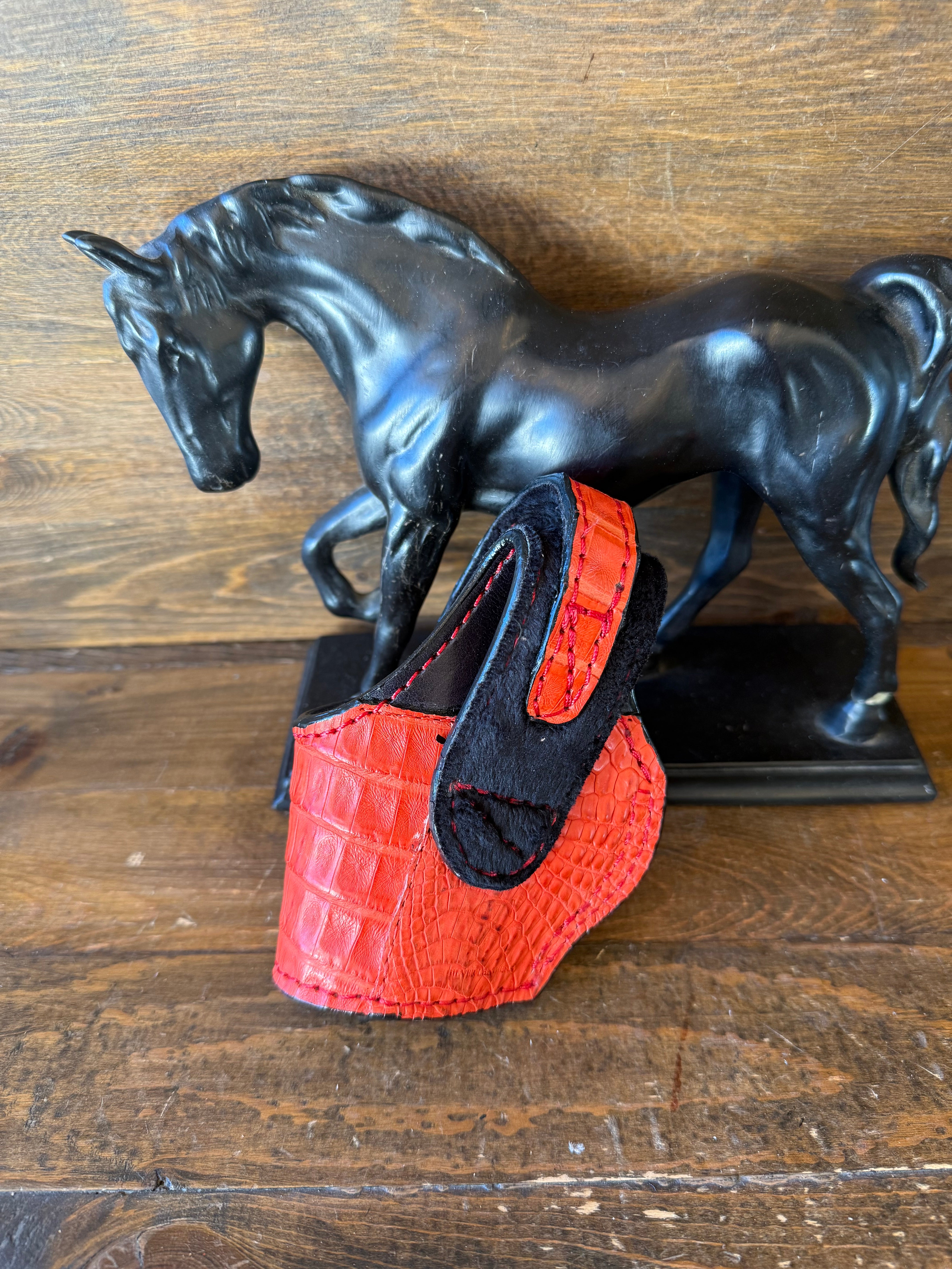 # H-341 . Red Crocodile/caiman tail skin luxury compact holster. Gold color snap button. Fits most of 1911 models. Luxury red velvet interior to prevent scratches. More colors available by order.